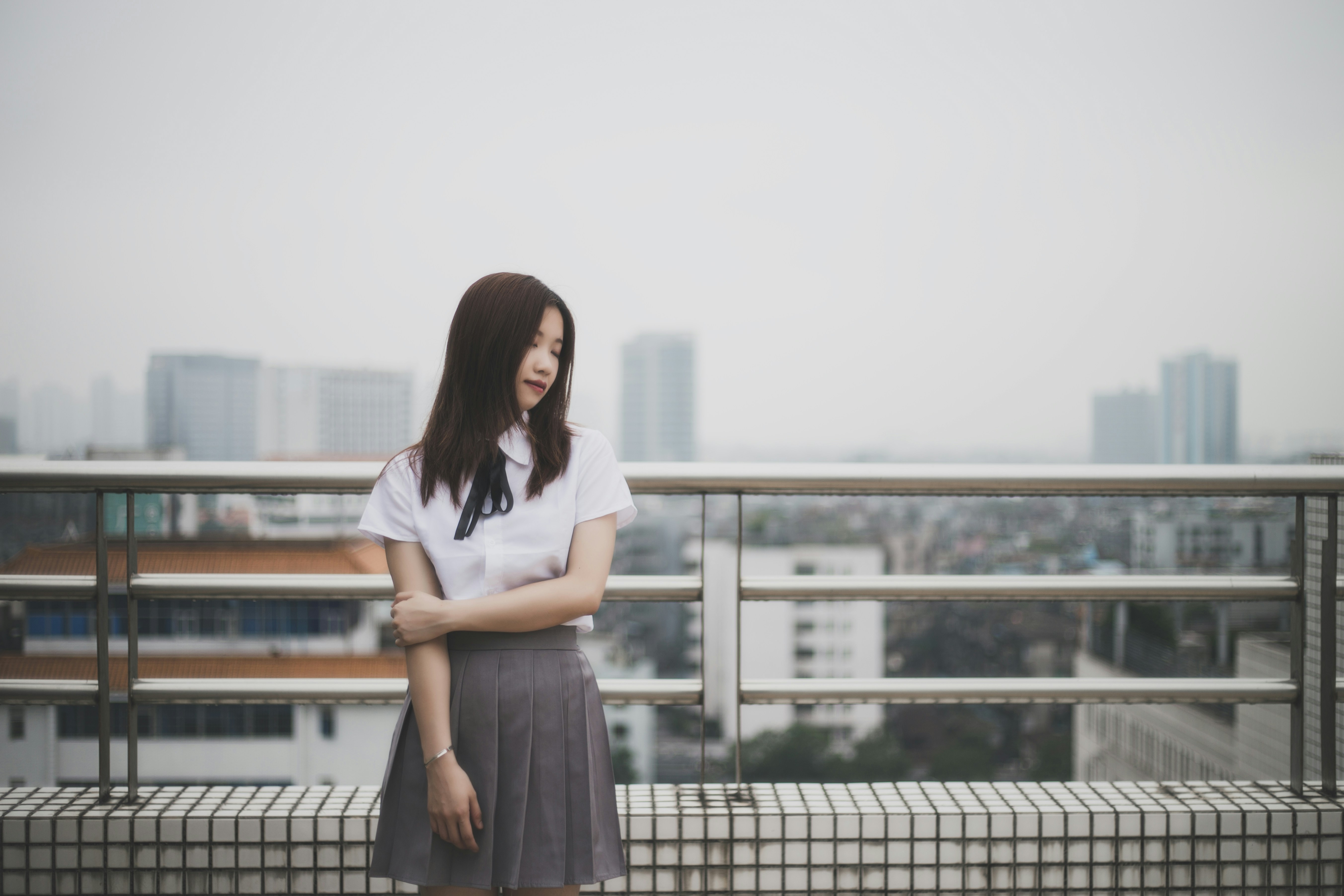 woman wearing white button-up blouse and pleated skirt